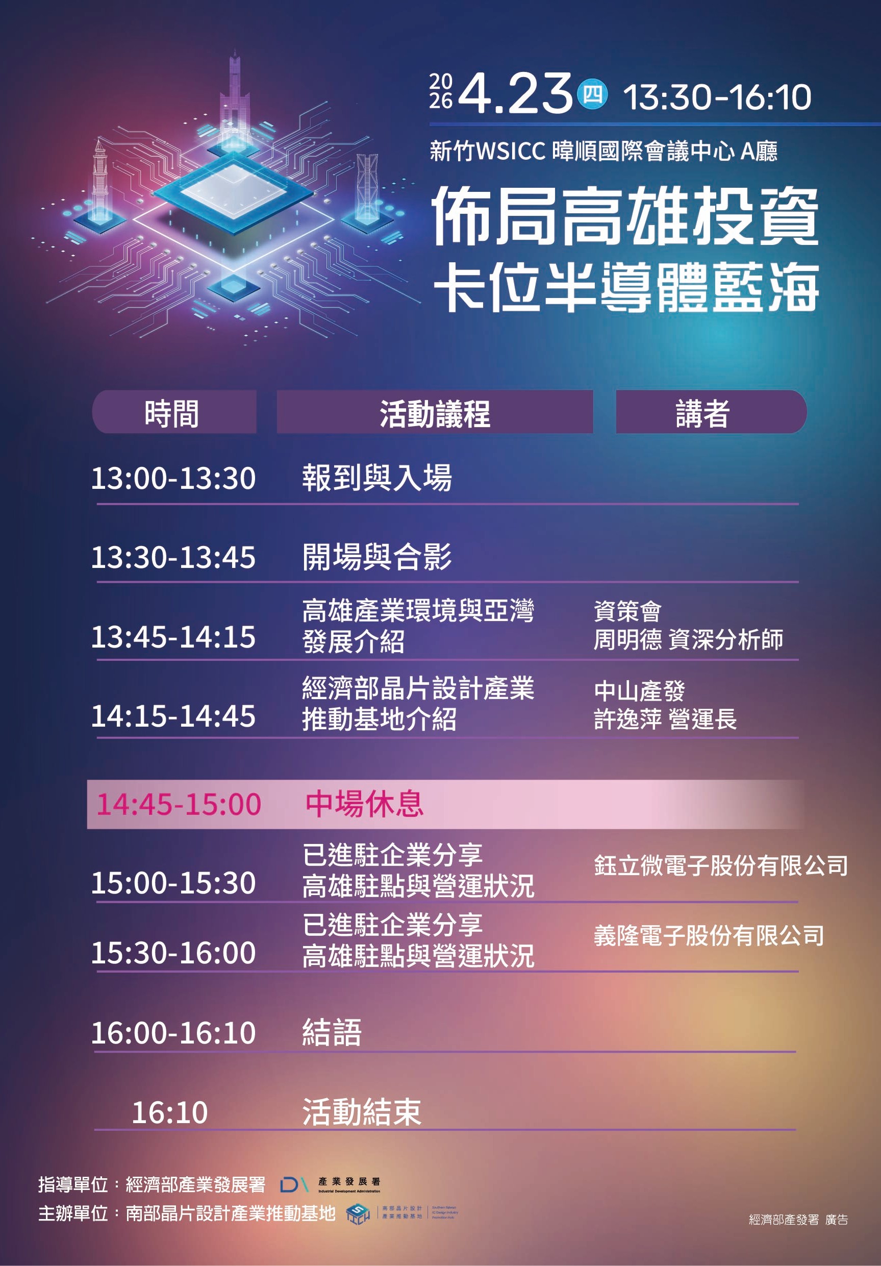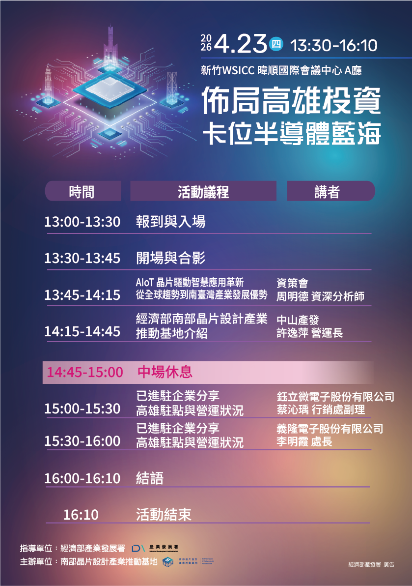 透過在地產業聚落現況、政策與資源支持說明,以及晶片設計產業發展基地與服務能量介紹,活動將具體呈現企業在高雄設點可對接的資源體系、合作模式與落地路徑,協助企業建立更具依據的評估基礎。